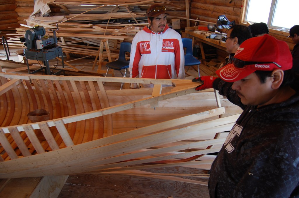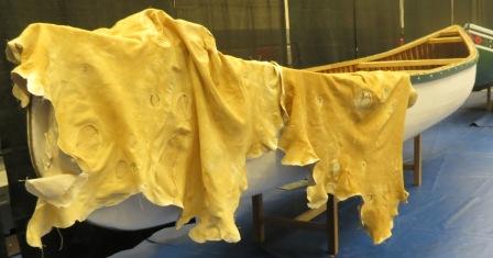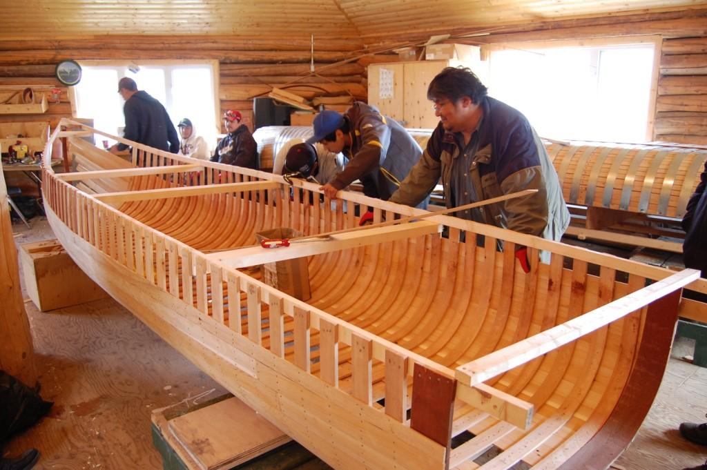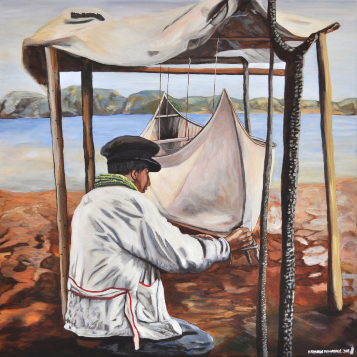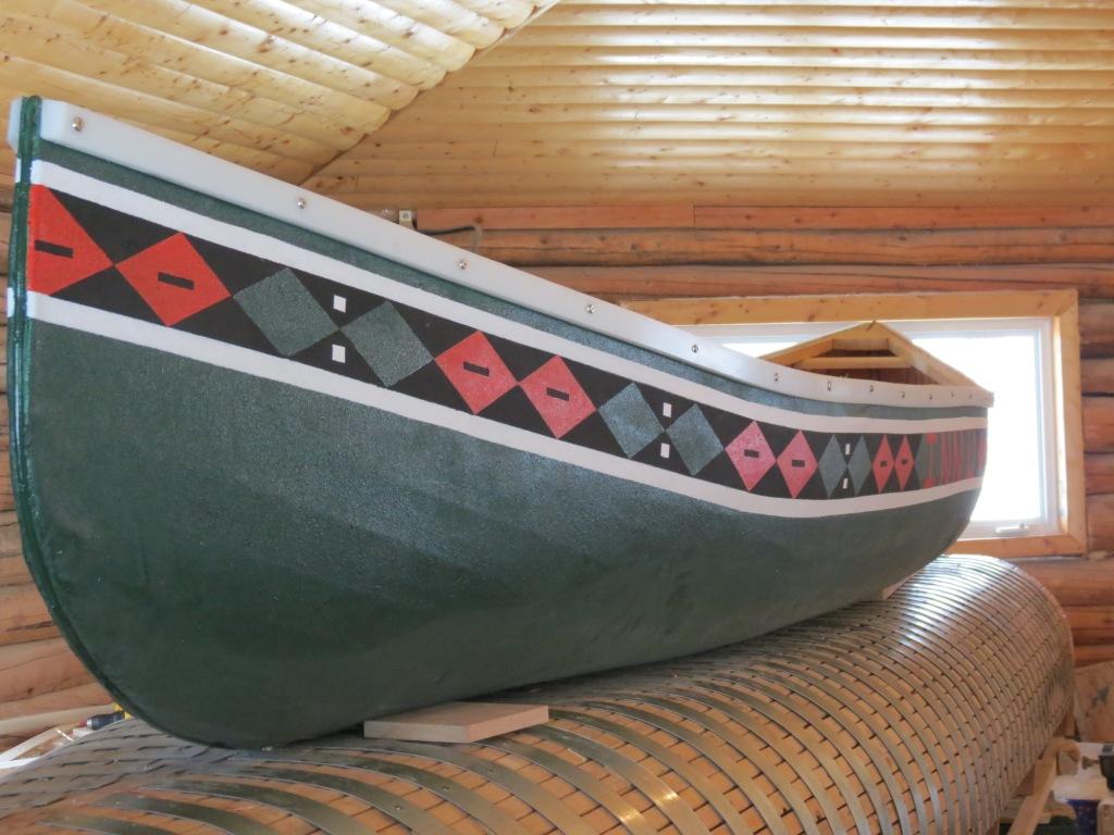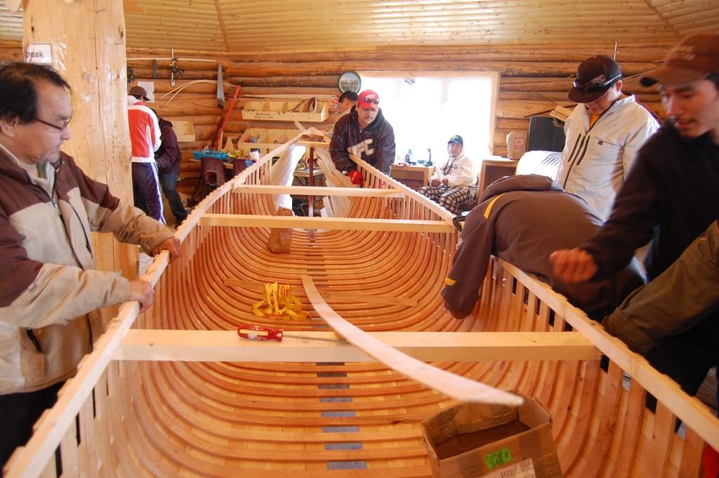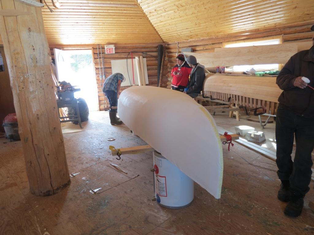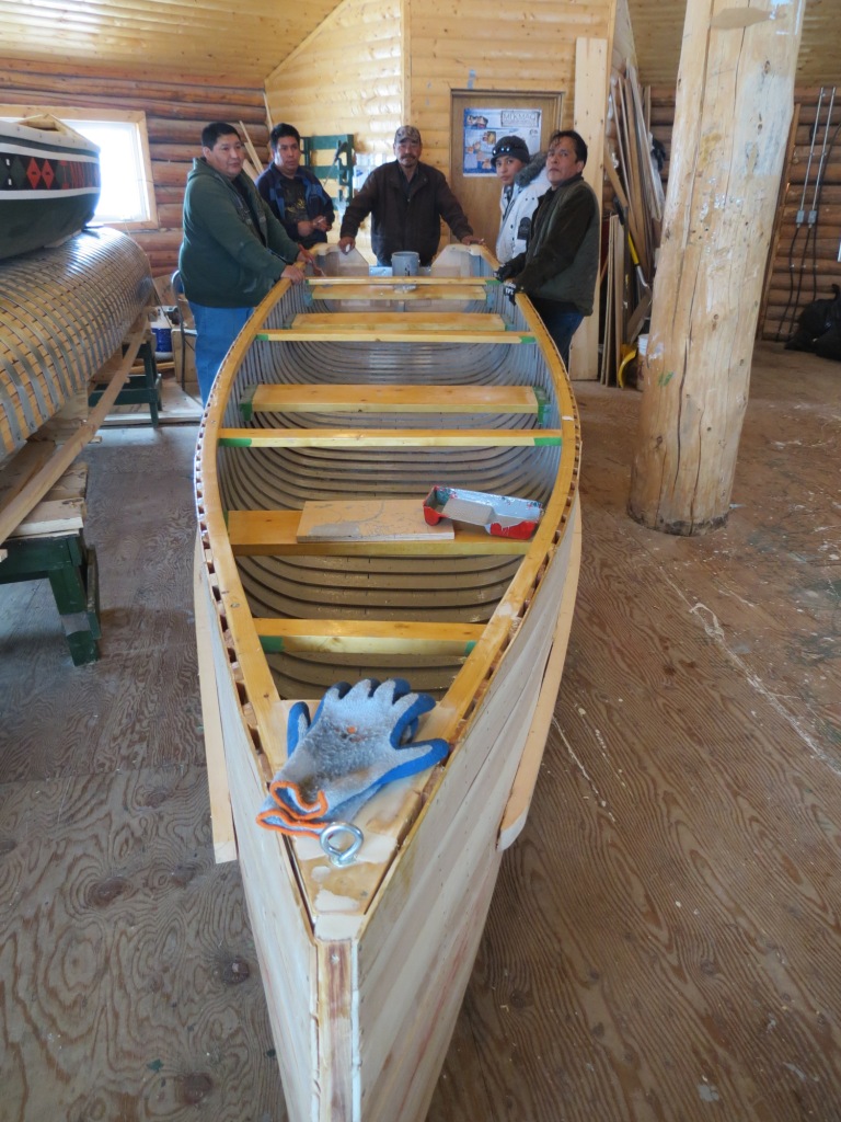 The Innu canoe is central to the history and culture of the Innu. For thousands of years it carried families who navigated the waters in warmer months. Its strength is in the planking where each one can be individually replaced should any damage occur. In years gone by, the skin of the canoe was birchbark but today it’s replaced by PVC canvas that is painted in green or white paint that was historically purchased from the Hudsons Bay Company in North West River. The tradition continues today as elders pass on their skills to the younger generation.