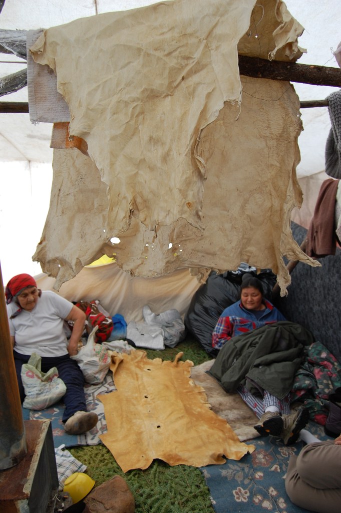 In the past, the Innu constructed long rectangular tents from Caribou hides that were carried with them during the hunt. Today the Innu tents are made of heavy canvas with a small woodburning stove in the centre that is used for cooking as well as warmth. The floor is made of soft spruce boughs. The images below are taken from Philomena (Testu) Pokues’s tent in Sheshatshiu 2011 where she was making Innu doughnuts on the woodstove.